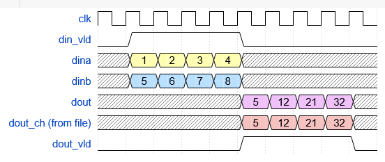 To make my testbench self-checking, I read the 16-bit inputs from a CSV file of 100,000 random signed input pairs generated from a test_vectors.py script that I (ChatGPT) wrote. That same test_vectors.py script also generates a file of 100,000 products of those two 16-bit inputs that I use in the testbench to verify the output of the multiplier module. Self-checking demands that your verification test vectors are absolutely correct, so Python’s multiplier operand better not let me down. Below is the timing diagram of the important stuff in the testbench.