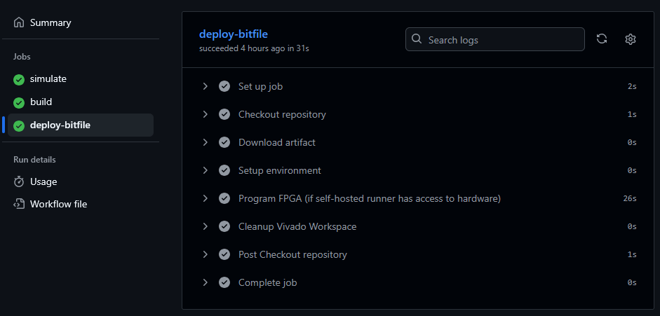 This is just a template for a simple FPGA workflow using Vivado with CI/CD. We were able to simulate, synthesize, implement, generate reports, and program an FPGA with a simple click of a button. I’d love to hear your HDL workflows and improvements on what I’ve written about here. The sky is the limit when it comes to CI/CD, and being primarily a hardware engineer, I’ve got a lot to learn.