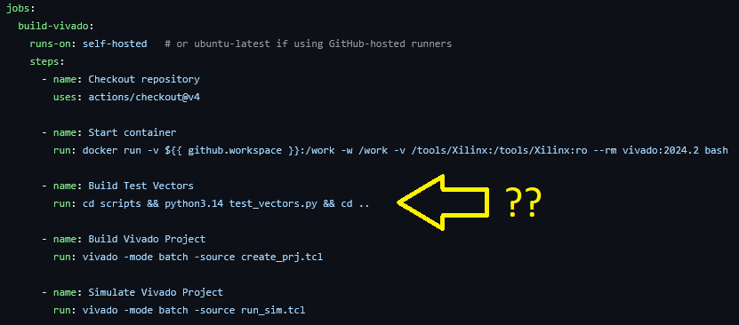 For the Vivado project, I did this in sections starting with simulation, then synthesis and implementation, and finally programming the FPGA. You can follow along in my main.yml file on the project page. For synthesis, I set up the runs to first execute the test_vectors.py file and generate the input CSVs. I then run the run_sim.tcl script and pass or fail the simulation. I purposefully pushed some commits with an error in the test_vectors.py script to induce a mismatch and stop the pipeline, which is where I learned about the exit code 1 requirement.
